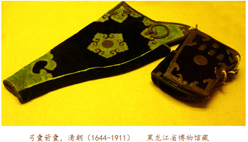 當(dāng)弓囊出現(xiàn)在眼前時,我們應(yīng)當(dāng)想到它的另一半——箭囊。實事上,古代盛裝弓箭的器物被稱為櫜鞬(gāo jiàn),櫜盛箭,鞬裝弓,多以皮革制作。比如明十三陵出土的萬歷皇帝陪葬品櫜鞬,就用皮革縫制,外敷黃色素緞,金繡龍紋,鑲嵌金飾件及各色寶石。一般來說,弓囊為上寬下窄的袋形,箭囊則為長方形。在蒙古語中,弓囊與箭囊合稱為“撒答”。因為“答”與“袋”讀音相近,所以元代的漢族作家便在作品中將之寫為“撒袋”。這樣,“撒袋”一詞便入了漢語詞匯,特指裝弓盛箭的袋子。