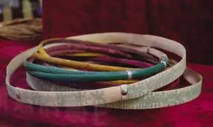 直到今天,腰箍仍在德昂族服飾中占有重要位置。按德昂人的習(xí)慣,姑娘成年后,就要在腰部佩上若干腰箍。這些腰箍大多用藤篾編成,藤圈寬窄粗細不一,有的漆成紅、黑、綠等色;有的刻上花紋,包上銀皮、鋁皮;還有的一半是藤篾,一半是銀絲。姑娘們以腰箍多、腰箍美為榮。因此,在戀愛期間,小伙子為了討姑娘歡心,往往費盡心機地制作精巧的腰箍相贈。腰箍從傳說的用來“拴住人”,演變成為用來“拴住心”。
