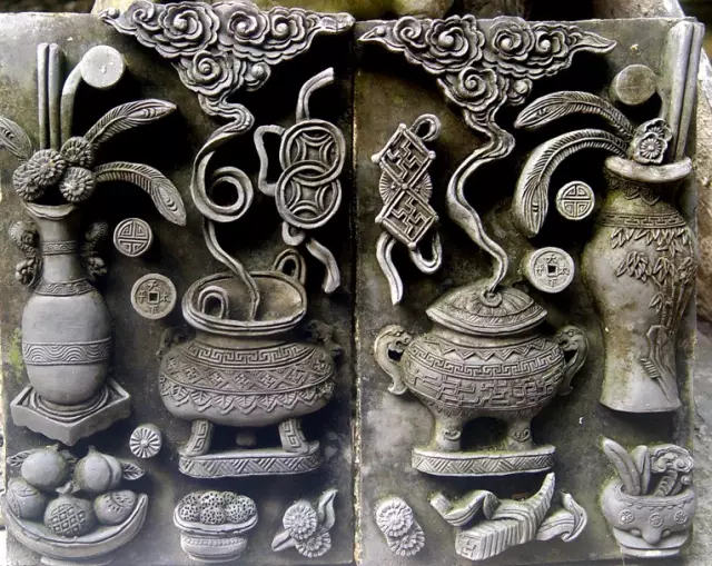 在藝術(shù)上,磚雕遠近均可觀賞,具有完整的效果。在題材上,磚雕以龍鳳呈祥、和合二仙、劉海戲金蟾、三陽開泰、郭子儀作壽、麒麟送子、獅子滾繡球、松柏、蘭花、竹、山茶、菊花、荷花、鯉魚等寓意吉祥和人們所喜聞樂見的內(nèi)容為主。在雕刻技法上,主要有陰刻(刻劃輪廓,如同繪畫中的勾勒)、壓地隱起的淺浮雕、深浮雕、圓雕、鏤雕、減地平雕(陰線刻劃形象輪廓,并在形象輪廓以外的空地鑿低鏟平)等。民間磚雕從實用和觀賞的角度出發(fā),形象簡練,風格渾厚,不盲目追求精巧和纖細,以保持建筑構(gòu)件的堅固,能經(jīng)受日曬和雨淋。