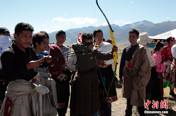 圖為青海省玉樹藏族自州當(dāng)?shù)孛癖娺M(jìn)行射箭比賽來慶?!般逶」?jié)”到來。來源:中新社 攝影:孫睿