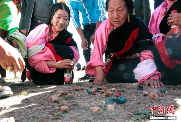 圖為青海省玉樹藏族自治州民眾玩貼改(骨節(jié))來慶祝“沐浴節(jié)”的到來。來源:中新社 攝影:孫睿