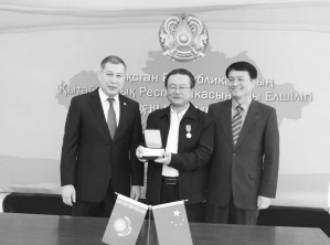 10月17日,艾克拜爾(中)被授予哈薩克斯坦外交部建立外交關(guān)系25周年金質(zhì)獎?wù)拢_克斯坦駐華大使沙赫拉特·努雷舍夫(左)為其頒發(fā)了獎?wù)隆?/span>