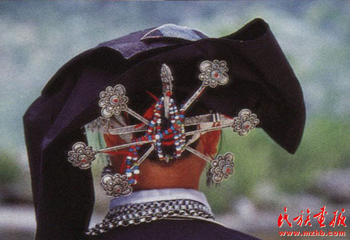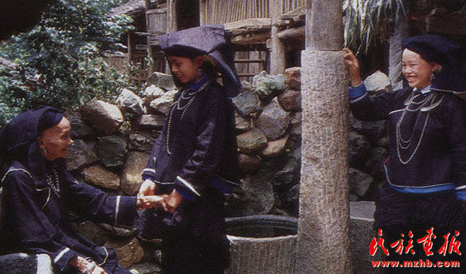 婦女的服飾更具特點(diǎn),無論老少,都喜歡穿右蓋大襟和葫蘆狀矮腳圓領(lǐng)的緊身短式上衣,下身以寬褲腳、大褲頭的褲子相搭配,腰系黑布做成的大圍裙,頭帶黑布大頭巾。其圍裙既寬且長(zhǎng),戴時(shí)能系周身有余,裙底垂掛到小腿下部,圍裙不僅作為裝飾,而且可以作為勞動(dòng)工具,遇趕圩或走親訪友和勞動(dòng)時(shí),可將圍裙底翻卷上來作成小包袱,用以包裝和盛裝物品。婦女頭巾都是一塊自己紡織染成的長(zhǎng)條黑布,戴時(shí)先圍繞在頭上,然后翻折擺布成火棱形的圖樣,罩在整個(gè)頭上,再把頭巾的兩端分別垂掛到雙肩上,看上去樸素美觀。同時(shí)還可以當(dāng)做帽子遮蔭用。她們的衣邊、衣角、袖口、裙邊和頭巾的四邊都用紅布或黃布剪成小條以后鑲捆上去,有的則用紅、黃、藍(lán)色絲線繡成波浪形的線條,使黑中襯出紅、黃、藍(lán)色的線條來,清雅明亮,色彩協(xié)調(diào)。再加上頭發(fā)插著龍頭形的銀簪,頸項(xiàng)上帶有銀鏈或項(xiàng)圈,手帶銀圈、玉鐲,耳掛珍珠耳環(huán)等,使人一看,黑中閃艷,樸素之中亦有玲瓏之美,表現(xiàn)了她們獨(dú)特的審美觀。