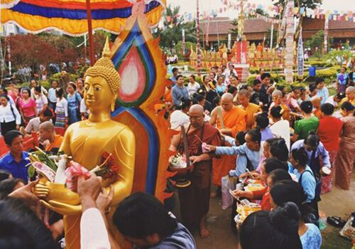 “奧瓦薩”時(shí)間在傣歷1 2月1 5日(陽歷9月中旬)。這一天,表示從“關(guān)門節(jié)”以來的安居齋戒期已滿,男女老幼皆盛裝去佛寺里拜佛,以食物、鮮花、蠟條、錢幣獻(xiàn)佛,向佛祖懺悔,祈求佛祖賜福降平安,同時(shí)舉行盛大的娛樂集會,“章哈”演唱,放高升、晚上放焰火、放孔明燈等,慶祝開門節(jié)。此時(shí),雨季已過,稻谷收割完畢,故也稱為慶祝豐收的節(jié)日。