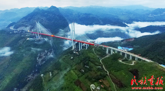 我國東西橫線大通道杭瑞國家高速公路的關(guān)鍵節(jié)點(diǎn)——畢節(jié)至都格高速公路北盤江大橋。該橋橋面到谷底垂直高度達(dá)569.66米,為世界第一高(鄧剛 攝影)