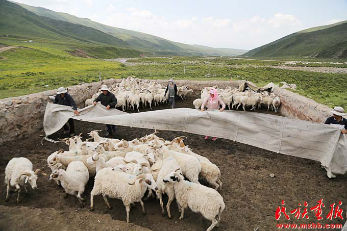 為響應退牧還草政策,海晏縣哈勒景村的蒙古族牧民改變過去逐水草而居的生活,通過禁牧、以草定畜等措施改變草原生態(tài)。海云一家將羊群驅(qū)趕到一起為羊接種疫苗(陳濤 攝影)