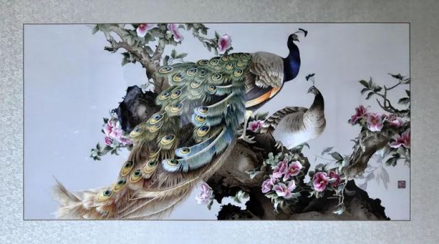 原作是畫家張玉明的工筆畫作品。一對(duì)孔雀棲息于爛漫盛開的山茶花間顧盼回首,相映成趣。整體繡面繡工精細(xì)、絲光迥動(dòng),將蘇繡精、細(xì)、雅、潔的特點(diǎn)表現(xiàn)得淋漓盡致。
