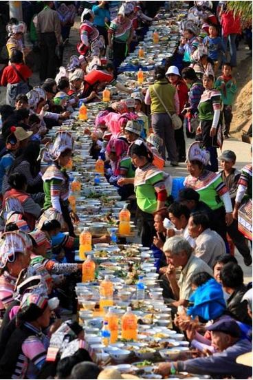 節(jié)日期間,哈尼寨子擺起長街宴,哈尼語叫“姿八多”,意為“互相輪流著敬酒”。小寨子擺一次,吃一天,大寨子則要擺兩三次,吃兩三天。每戶做一桌酒菜,抬到寨子街道上擺好,一戶接一戶沿著街道擺成長街宴,八個或十個人自愿結(jié)合為一桌暢飲。大寨子分片輪流做東,負責(zé)長街宴的酒菜,其他片的人做食客,從早吃到晚,場面十分熱鬧。