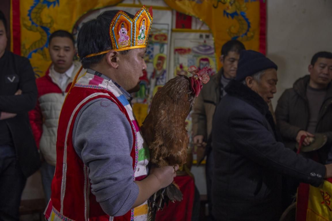 進(jìn)錢之后是解冤,解冤法事一邊解冤錢,一邊先生唱詞,一直到冤錢解完。然后用冤錢連接紅線,法事將完,就把冤錢去掉,放在篩盤中,把冤錢架上的白布、紅線、篾條一并放入篩中把雄雞抱起,打卦,把篩盤由一個抬起,離開中堂,關(guān)上大門,在三岔路口燒掉茅人。