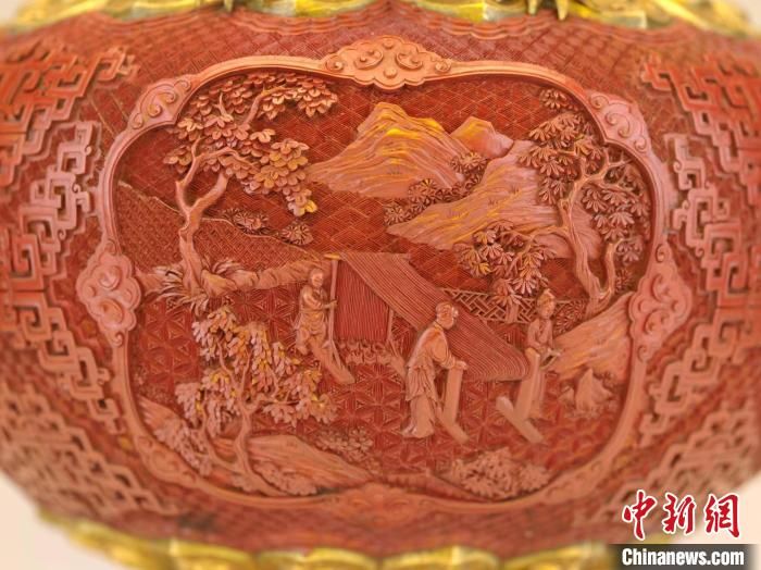 沈陽故宮博物館相關負責人表示,此件漆器工不厭精,裝飾富麗,帶有乾隆朝剔紅漆器精致華美、大氣雍容的時代風格,反映了清代盛世的審美趣味。男耕女織的雕刻圖景反映清朝統(tǒng)治者以農桑為治國之本的思想觀念。此次沈陽故宮展出乾隆款剔紅開光山水人物紋龍耳瓶,意在用文物展現中華文明之美,讓人們感受中國傳統(tǒng)藝術珍品的博大精深和意境之美。
