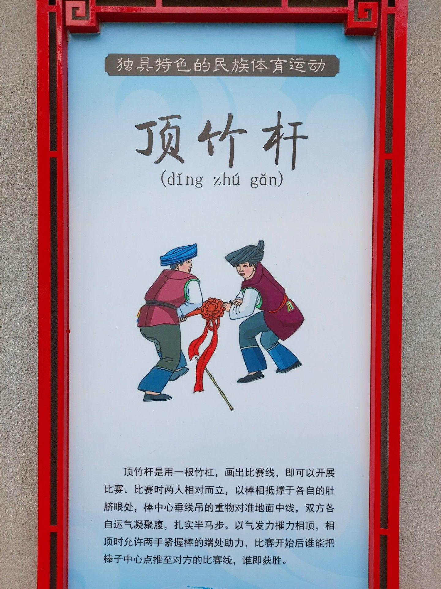 頂竹桿是用一根竹杠,畫出比賽線,即可以開展比賽。比賽時(shí)兩人相對(duì)而立,以棒相抵撐于各自的肚臍眼處,棒中心垂線吊的重物對(duì)準(zhǔn)地面中線,雙方各自運(yùn)氣凝聚腹,扎實(shí)半馬步。以氣發(fā)力摧力相頂,相頂時(shí)允許兩手緊握棒的端處助力,比賽開始后誰(shuí)能把棒子中心點(diǎn)推至對(duì)方的比賽線,誰(shuí)即獲勝。