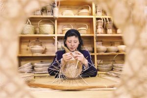 在貴州省赤水市一家竹編作坊,一名竹編藝人在編制果盤。 王長育攝