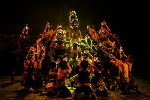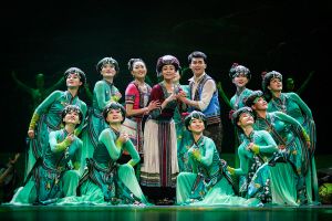 在舞劇敘事方式上,總導(dǎo)演之一董華興將民族性與現(xiàn)代性相融合,嘗試時(shí)空切換,段落重組,故事情節(jié)的倒敘、插敘,真實(shí)性與虛擬性相結(jié)合等方法?!耙魳分谱?、舞蹈語匯、服裝設(shè)計(jì)等方面都要符合當(dāng)?shù)厝罕姷纳?,接地氣老百姓才會喜歡?!薄缎腋;ㄉ健房倢?dǎo)演之一馬文靜說。