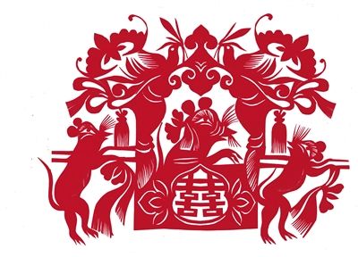 冬日的陽(yáng)光透過(guò)玻璃窗,灑在老屋的炕上。幾位婦女在炕上鋪一塊布,對(duì)窗盤腿而坐,然后一手捏紅紙,一手拿剪刀,神情專注地剪“老鼠嫁女”。這是春節(jié)前在和林格爾縣河頭村看到的畫面。老鼠嫁女,也叫老鼠娶親,在傳統(tǒng)剪紙中有不同的版本。據(jù)了解,民俗剪紙“老鼠娶親”在清道光年間就開(kāi)始流行了。欣賞和林格爾剪紙傳承人創(chuàng)作的“老鼠娶親” ,老鼠的形象多采用粗獷輪廓,又用細(xì)線條加以襯托,如老鼠胡子、花轎穗子、喜鵲羽毛、花紋等。河頭村的婦女剪窗花時(shí),鼠是常表現(xiàn)的題材之一,被稱為“靈人”,如老鼠舔燈盞、老鼠偷瓜、老鼠吃葡萄、鼠咬天開(kāi)等。幾十年前,段蓮女老人剪的老鼠靈活生動(dòng),富有動(dòng)感,遠(yuǎn)近聞名,她的 “吉祥鼠”剪紙技藝傳承至今。