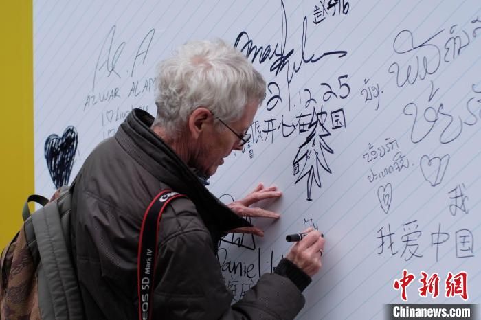 一名外國(guó)友人參觀畫展,并簽名。 劉俊聰 攝