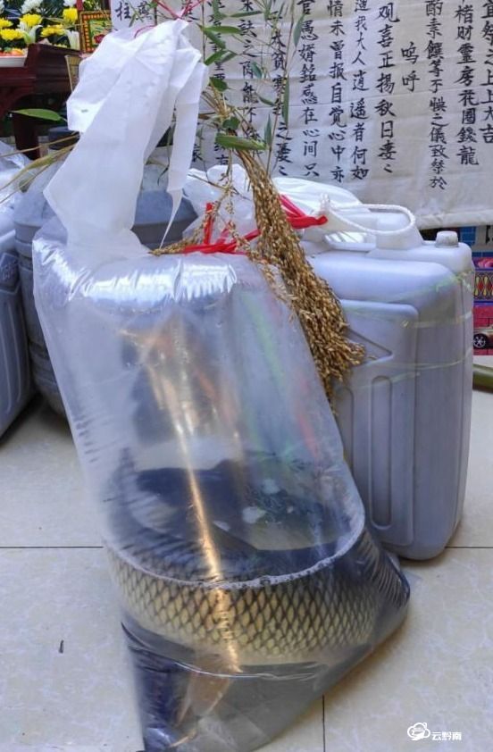 這幅圖片拍攝于都勻殯儀館,是在一位水族干部的葬禮上,三都水族自治縣九阡鎮(zhèn)的內侄們從家鄉(xiāng)趕來憑吊姑父時,送來了三條大活魚、一頭小豬、一壺米酒等物。水族有忌葷不忌魚的習俗,內侄送魚表示與表兄弟姊妹一道忌葷,共同戴孝,共同守制;送來的小豬為堂祭犧牲,祭奠亡人。