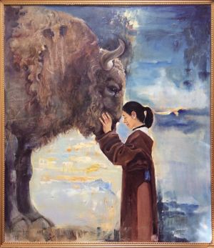 雍忠卓瑪?shù)膫€(gè)人畫(huà)展受到業(yè)內(nèi)外的諸多好評(píng),也有觀(guān)眾專(zhuān)程從外地去拉薩觀(guān)展。展覽結(jié)束當(dāng)天,雍忠卓瑪特意和畫(huà)作《我和它》合影,并將合影發(fā)布在社交平臺(tái)上?!斑@是我與牦牛博物館結(jié)緣的作品。”她向記者介紹。畫(huà)面上,穿著藏袍的少女閉著眼睛,用左手撫摸牦牛的面頰,額頭輕觸牦牛鼻尖,表情寧?kù)o祥和。