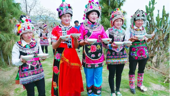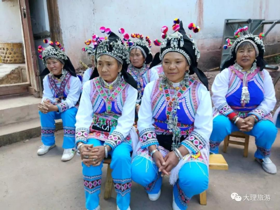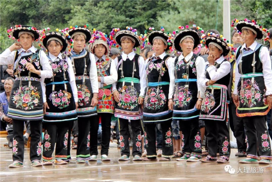 男子頭頂氈帽(又稱(chēng)氈窩),穿大襟衣、大襠褲,赤足或穿草鞋,披羊皮,外出背皮袋(現(xiàn)已基本消失)。女子裹高包頭、額上飾銀桂花,衣為布襟,外套坎肩,腰系大圍腰,大圍腰左右下三邊繡五色花,為動(dòng)植物圖案,足穿繡花鳳頭鞋,用本地產(chǎn)綠布條制褲子,不鎖腳邊,腰間背圓形白氈裹背,所穿服飾顏色鮮艷、質(zhì)地厚重,盡顯遠(yuǎn)古南詔皇室服飾遺風(fēng)。