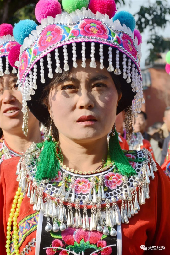 踏歌會(huì)上,來(lái)自彌渡彝族聚居地的各村各寨男女老幼穿戴整齊,云集在鐵柱廟,這里便形成了五彩斑斕的彝族服飾比賽場(chǎng),每位彝族婦女的頭飾就是她心靈手巧的見(jiàn)證。