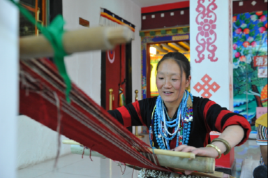 在自治區(qū)群藝館的展出現(xiàn)場,除卻這些光鮮亮麗的民族服裝之外,另一個特殊群體也同樣吸引了眾人的目光,他們便是從西藏各個地區(qū)前來為觀眾展示藏裝制作工藝的民間手工藝人。他們有的在織布,有的在裁剪,有的在穿針引線做靴子、縫制衣服,這些數(shù)以萬計的、平凡而又偉大的民間手工藝人們,用他們幾十年如一日的堅守,默默地承擔(dān)著民族文化創(chuàng)新與傳承的歷史使命。