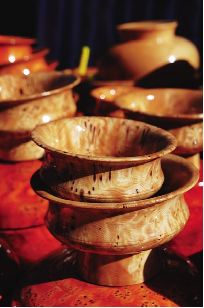 官員們使用的木碗,固然也非常注重外面的金銀寶石包裹,而木碗本身,也有一套非常固定的學問,盛開水不裂,摔到地上不會破,不燙手不冰手,體輕而質(zhì)固,經(jīng)久耐用,可以爺孫相傳。用這種碗盛食,可以完全保持食物原味,吃酥油糌粑等油肉類食品猶為適宜。比之于一般瓷碗,是碗中上品。這種木碗一般都是選用一些稀有雜木的節(jié)或者根雕琢而成,除了材料本身,在加工過程中的工序也十分重要,必須要加工出來一些獨特的花紋,比如磷火紋,或豬鬃紋,或貓頭鷹眼紋等,有這種花紋的碗,就要格外名貴,比如這次普布次仁兄弟所制作的大型核桃木碗,全身均勻地布滿了貓頭鷹眼紋,所以才能賣出這么高的價格。在西藏很多地區(qū),都流傳著這樣一個諺語:“一只上等木碗等于10頭牦牛?!?/p>