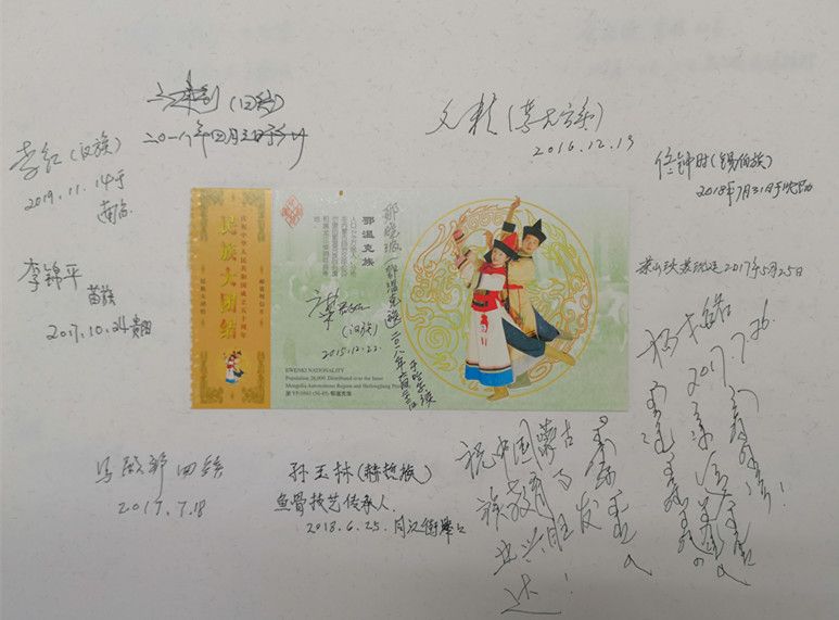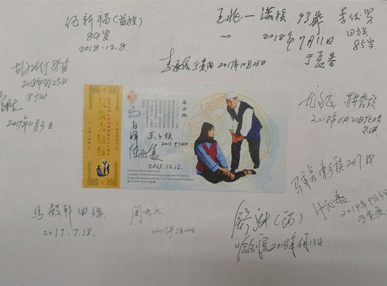 在采集口述影像錄音資料的同時,項目組還收集了大量的珍貴歷史照片以及相關(guān)文物。值得一提的是,他們設(shè)計了一種非常有特色的受訪者簽名簿,中間貼著繪有56個民族的音樂舞蹈圖案的首日封或明信片,四周簽上受訪者的人名簽名字、民族特征,有些還用民族文字書寫,體現(xiàn)了中華各民族團結(jié)在一起的精神風(fēng)貌。簽名簿有厚厚的幾大本,設(shè)計精美,承載著民族工作口述史資源采集的經(jīng)歷,具有豐富的文化內(nèi)涵和博物館收藏價值。