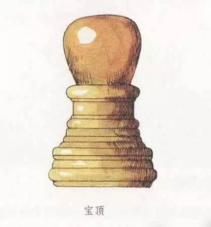 在建筑物的頂部中心位置,尤其是攢尖式屋頂?shù)捻敿馓?,往往立有一個圓形或近似圓形之類的裝飾,它被稱為寶頂。在一些等級較高的建筑中,或者確切地說,在皇家建筑中,寶頂大多為銅質(zhì)鎏金材料制成,光彩奪目。