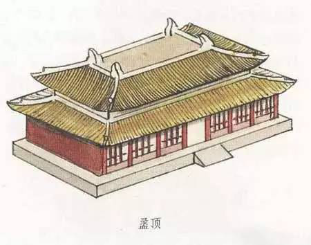 盝頂,是一種較為特別的屋頂形式。這種屋頂形式是在屋頂上有四條與屋檐平行的屋脊,四條屋脊構(gòu)成一個長方形或正方形的平頂,其四角各有一條垂脊向下斜伸,共形成四塊坡檐。盝頂這種頂式在古代大型宮殿建筑中極為少見。