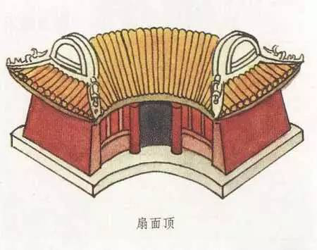 扇面頂和萬字頂一樣,是一種非常別致的屋頂形式,扇面頂顧名思義,就是扇面形狀的屋頂形式,其最大特點(diǎn)就是前后檐線呈弧形,弧線一般是前短后長,即建筑的后檐大于前檐。建筑的西山墻的墻線若向內(nèi)延伸,可以交于一點(diǎn),而這一點(diǎn)就是扇形的扇子柄端。扇面頂?shù)膬啥丝梢宰龀尚健疑?,也可做成卷棚形式。扇面頂一般都用在形體較小的建筑中,會讓建筑看起來更為小巧可愛。