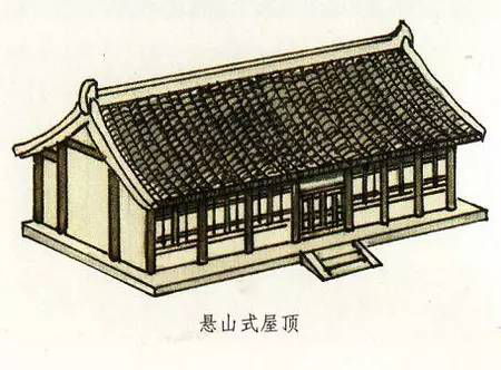 懸山式屋頂與硬山式屋頂一樣有一條正脊和四條垂脊。不過,它又有不同于硬山式屋頂那樣與山墻平齊,而是伸出山墻之外。這部分伸出山墻之外的屋頂是由下面伸出的桁(檁)承托的。所以懸山式屋頂不僅有前后出檐,在兩側(cè)山墻上也有出檐。懸山式是兩面坡屋頂?shù)脑缙谧龇?,不過中國古代的重要建筑基本沒有使用懸山式屋頂?shù)?,特別是唐代以前尤為少見。