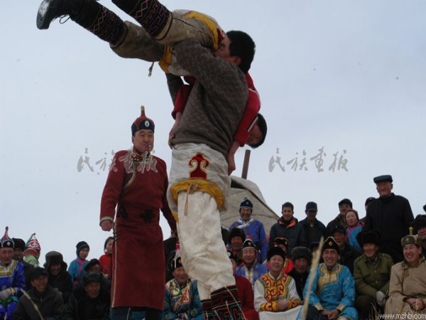 春節(jié),蒙古人稱為“白節(jié)”、“大年”,是蒙古人傳統(tǒng)節(jié)日,時(shí)間在農(nóng)歷正月初一。居住在農(nóng)村、城市、工礦區(qū)的蒙古族過(guò)春節(jié)的習(xí)俗同漢族差不多,但牧區(qū)有許多不同的特點(diǎn)。除夕之夜為“守歲”,合家老小席地坐在蒙古包中的矮桌周圍,桌上擺著一盤盤香噴噴的肉類、奶食品,以及糖果、香煙、美酒等物,有的還要在矮桌上供一張大紙,紙上寫著祖先的名字。午夜,開始飲酒吃年飯,或吃除夕餃子。按規(guī)矩團(tuán)圓之宴要多吃多喝酒、肉,食器要擺滿滿一席。如吃不完也要剩得越多越好,象征新的一年里吃喝不盡、年年有余。家里的年輕人,要向長(zhǎng)者敬“辭歲酒”。特別有意思的是全家共吃一塊由酥油、糖、白面烙成的大圓餅,這叫吃新年餅,每人只吃一口,意思是全家永不分離,永久團(tuán)圓,永遠(yuǎn)過(guò)甜甜蜜蜜的日子。除夕之夜要?!案吕尽保ㄍ嫜蚬穷^)、說(shuō)書、唱歌、跳舞,通宵達(dá)旦,熱鬧一宿。過(guò)大年,按習(xí)慣還要拜年,大年三十晚上為辭舊歲禮, 初一早上為迎新年,晚輩給父母和老人叩頭、敬酒、獻(xiàn)哈達(dá),祝老人們身體健康,晚年幸福!老人擁抱孩子們,并斟上一碗鮮奶,祝愿子女們幸福,像牛奶一樣純潔。大年初一早餐后,男女盛裝,三五成群來(lái)到浩特(村鎮(zhèn)),挨家串戶給親友拜年??腿诉M(jìn)屋首先向長(zhǎng)輩叩頭拜年,祝愿老人身體健康,年豐人壽。按習(xí)慣由主人家的女婿向客人逐個(gè)敬酒,每敬必喝,或邊喝邊唱,邊唱邊舞。