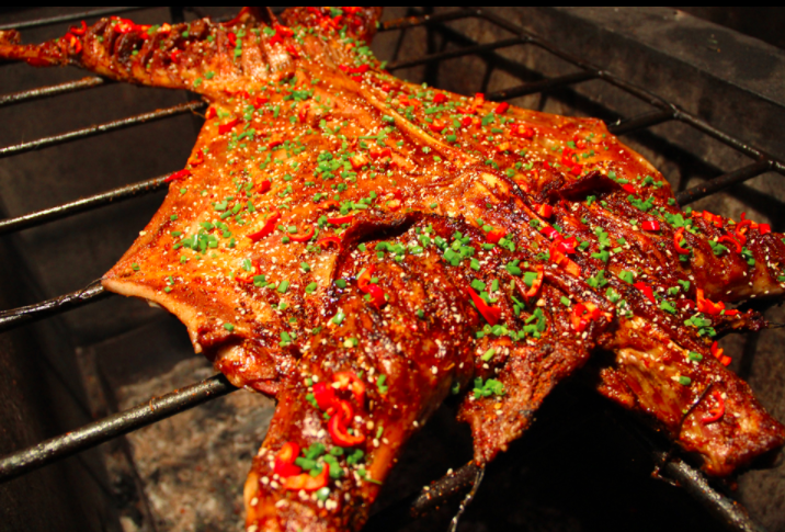 全羊是蒙古族在喜慶宴會和招待尊貴客人時使用的食品。蒙古語把全羊叫“首思”。在宴席中如果上全羊,則稱全羊席。在全羊席中,一般是在食客吃了牛羊肉制的冷熱菜正趨興奮之時上全羊。一種是讓客人觀看后撤回廚房,把皮層肉片切成半寸寬、二寸長的方塊,放在大盤內(nèi),再把貼骨肉切好,一同上桌。另一種是廚師當(dāng)客人的面切塊。一般上烤全羊后,隨上蒙古包子和大米飯、羊骨湯。
