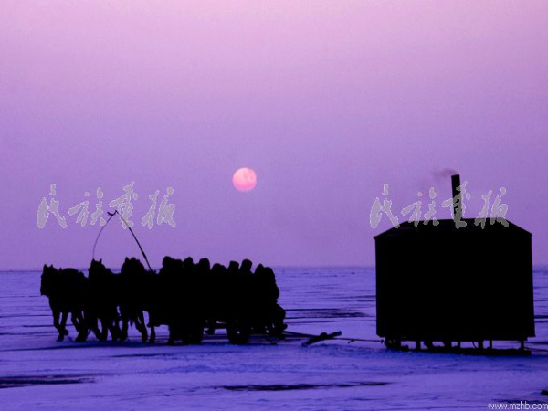不知不覺,夕陽垂近在遠處的冰面,夜幕降臨了。游客、魚販、漁工跟著運魚的馬爬犁漸漸離去。迎著晚霞,我們也戀戀不舍地離開了查干湖……