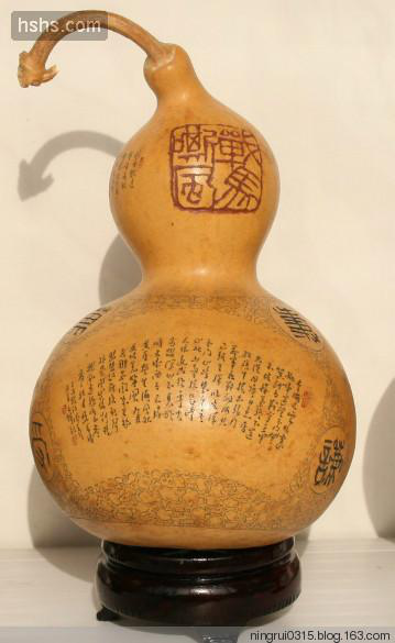 葫蘆雕集繪畫、書法、篆刻藝術(shù)于一體,傳承和發(fā)展了我國傳統(tǒng)“葫蘆文化”。甘肅的雕刻葫蘆最早出產(chǎn)于蘭州,距今約100多年,據(jù)說早期的蘭州雕刻葫蘆比較簡單,對葫蘆不會做刮皮、磨光等加工處理,也不填色;只是在葫蘆表皮雕刻出山水、風景或戲劇人物,作為兒童的玩具,在街頭巷尾出售。到了清代光緒年間,秀才蘭州人李文齋對葫蘆雕刻工藝做了改進。他針對當時雕刻表面粗糙、題材單調(diào)的弊端,首先將葫蘆原生表皮刮去、磨光,并用鏹水混合燃料,染成紅黃二色,是雕刻的景物不易脫落;其次,擴大圖案創(chuàng)作題材,在原有山水、花草等圖案基礎(chǔ)上,增加了如《桃花源記》、《蘭亭集序》、《竹林七賢》等歷史文化和神話故事,形成了圖文并茂的題材格局;最后是在雕刻工具上采用了以針代刀,使圖案形象更加情景交融,栩栩如生。其雕刻葫蘆的特點主要是求其意態(tài)之美,追求神似;人物寥寥數(shù)筆,山水花卉濃淡相宜,形神兼具,求其風雅;題款文字、細如蚊足,點綴成行,瀟灑自如。