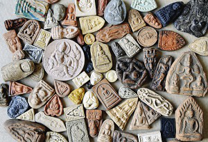 我在曼谷一家有40年歷史的佛像店“佛光工藝社”采訪時(shí)問到老專家這樣一個(gè)問題:泰國現(xiàn)在大概有多少種圖案的帕肯?所有聽到這個(gè)問題的人都是一聲驚嘆,然后笑說:“無數(shù)!”我非要問出個(gè)數(shù)來,他們便告訴我,泰國是一個(gè)歷史劃分復(fù)雜、族源廣博的國家,因此其包容性很強(qiáng),雖然九成以上的人信仰佛教,但是婆羅門教、道教、伊斯蘭教、基督教等在泰國都被接納,還有本土的一些法術(shù)也不曾被丟棄。所以,每天每個(gè)來定做的人都會(huì)有不同材質(zhì)的要求,不同圖像、符咒的組合,僅一個(gè)工藝社40年來就已經(jīng)做過幾十萬種的圖案組合。我收藏的擦擦有不同年代、不同材質(zhì)、不同價(jià)值的,除去年代久遠(yuǎn)的,頗有價(jià)值的就是一個(gè)藥擦,那是一個(gè)大威德金剛擦,專家說從被剝落的剖面看,里面有藥材的成分。我知道,在西藏,擦擦因材質(zhì)和制作人不同而有很大的區(qū)別。擦擦中最為稀有難求的一種叫“布擦”,那是寺廟僧人在保存活佛法體的時(shí)候,將那些浸透活佛法身血水的鹽巴或其它藥物和泥土融合后制成的。另一種較為珍貴的擦擦是活佛的骨灰與泥土摻混在一起制作而成的。還有一種藥物擦擦,是用不同的名貴藥材如珍珠、瑪瑙、藏紅花等藏藥合成制作,可服用治病。最普通的擦擦用一般的泥土制作,好一點(diǎn)的有膠泥、陶土、白泥等,這種擦擦成本低廉,在民間流傳最廣。