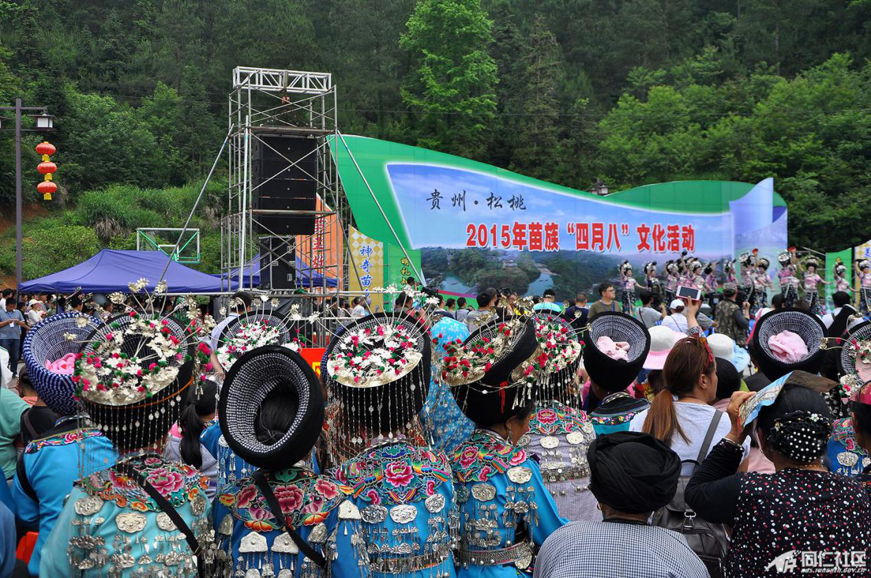 “四月八”的由來(lái)傳說(shuō)甚多,主要是為憑吊“四月八”葬于今噴水池一帶的古代苗族英雄,輩輩相傳,而成習(xí)俗。傳說(shuō)古代有一個(gè)名叫“亞努”的苗族首領(lǐng),領(lǐng)導(dǎo)苗民向統(tǒng)治者進(jìn)行斗爭(zhēng)。他曾組織各寨苗族頭人在“喝血坳”地主喝雞血,發(fā)誓共同聯(lián)合,戰(zhàn)斗到底。并約定四月八日在某山聚眾起義。起義后,義軍連連獲勝,一直打到了四川、貴州。第二年的四月八日,亞努不幸戰(zhàn)死在貴陽(yáng)市的噴水池附近。苗族人民為了紀(jì)念這位民族英雄,便于每年的四月八這一天,舉行紀(jì)念活動(dòng),追思亞宜的業(yè)績(jī),為戰(zhàn)死者掃墓。清代乾嘉苗民起義后,統(tǒng)治者禁止湘西苗族人民舉行這一活動(dòng),新中國(guó)成立后經(jīng)國(guó)家民委批準(zhǔn),將“四月八”定為苗族統(tǒng)一的節(jié)日(圖為2015年貴州松桃苗族“四月八”節(jié)慶盛況,引自貴州銅仁政府網(wǎng)“同仁社區(qū)”)。