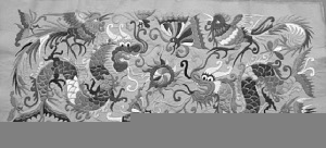 曾憲陽(yáng)的收藏中,有一件貴州月亮山蠟染“百鳥衣”,極為罕見(jiàn)?!皾h文古籍中描述的人面蛇(龍)身的女媧,牛(人)首蛇身的伏羲,以及兩頭蛇、多頭蛇、雙身蛇的形象,在這一件服飾中都可以看到。”曾麗說(shuō),云雷紋、回紋等商周青銅紋飾在許多苗族服裝中的兩袖及前后擺都要使用;人物的衣裙、動(dòng)物的身軀也大量使用青銅紋填充……