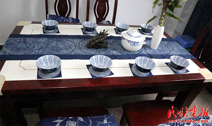 楊文斌老師和她的夫人梁定芳老師都是“非遺”傳承人?,F(xiàn)在他們忙著著書、講學(xué)、開研討會(huì)。談起蠟染、談起民族民間工藝,楊文斌老師滔滔不絕:“現(xiàn)在要從三個(gè)方面認(rèn)識(shí)和研究民族民間工藝:一是從歷史學(xué)、人類學(xué)、民族學(xué)的角度解讀,二是從審美學(xué)、藝術(shù)視覺(jué)理念的角度解讀,三是從工藝學(xué)、材料學(xué)、技藝學(xué)的角度解讀。現(xiàn)在植物染料的加工和染色技藝消失得很快。老祖宗留下的寶貝到我們這代可不能扭曲和斷裂?!?/p>