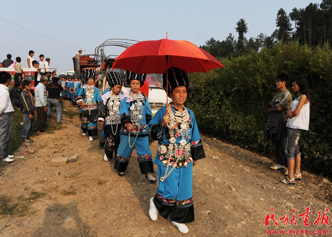 苗族送親隊(duì)伍來(lái)到新郎家的寨口,寨老為新娘主持“回喜神”儀式。楊昌垠,引自民族畫報(bào)