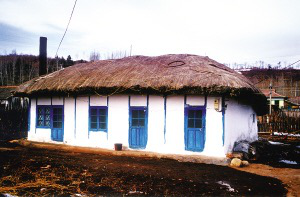 水稻的大面積種植提供了充足的稻草,它們可用于紡草繩、苫屋頂。因此,苫蓋稻草的屋頂也是朝鮮族民居的特色。四面墻壁很薄,中間立木柱,兩面釘薄板或綁扎秫秸,以草泥抹平,刷白灰。每個(gè)窗、門(mén)兩側(cè)依木柱成框,并刷藍(lán)色,后墻只留一門(mén),不設(shè)窗。間壁墻上架柁,柁上搭檁木、鋪椽子,再鋪秫秸,鏝一層黃泥,即成屋頂。從屋頂四周。