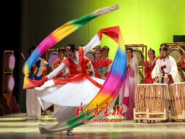 朝鮮族舞蹈種類(lèi)繁多,各具特色。除了傳統(tǒng)的農(nóng)樂(lè)舞、象帽舞、長(zhǎng)鼓舞和頂水舞之外,還有雄壯的刀舞、典雅的扇子舞、神秘的假面舞等等,它們或舒緩,或剛毅,或柔美,或稚拙,輕歌曼舞間,你仿佛觸摸到了一個(gè)古老民族的靈魂,它是那么深沉內(nèi)斂,又是那么熱情奔放!