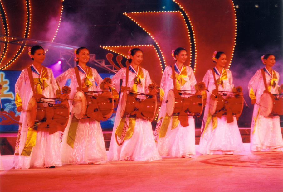 扇舞:表演者多為女性,需持花扇表演。源于古代巫女活動及民俗活動中的扇子表演,后發(fā)展成為單扇舞、雙扇舞兩種形式。扇舞有持一把或兩把扇具的不同形式,它具有朝鮮族特有的節(jié)奏、含而不露的內(nèi)在情緒、曲線性的律動和自由自在的表演,隨著隊形的不斷變化,舞者將手中的扇具可組合成豐富多樣的圖案和造型。