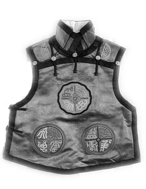 坎肩,又稱背心、馬甲。巴圖魯坎肩是京師八旗旗人最時尚的一種款式,其樣式是在“一字形”的前襟上裝有排扣,兩邊腋下也有紐扣?!鞍蛨D魯” 一詞源自少數(shù)民族語,是我國北方某些民族專門賜給強悍勇士們的美稱。 巴圖魯坎肩源于蒙古族杜爾伯特部男子穿兩邊有衩的大襟短坎肩。早先有27道扣袢兒,胸前9道扣袢兒,兩側(cè)各9道扣袢兒,后來變成胸前9道,兩側(cè)各7道扣袢兒,以白色綢緞為面料,以青色綢緞為沿邊兒。巴圖魯坎肩從前是兵卒之服,早先在面料和里子之間安放魚鱗式薄鐵片,作為保護身體的甲片。