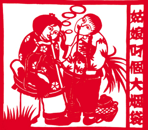 滿族風(fēng)情剪紙《姑娘叼個(gè)大煙袋》