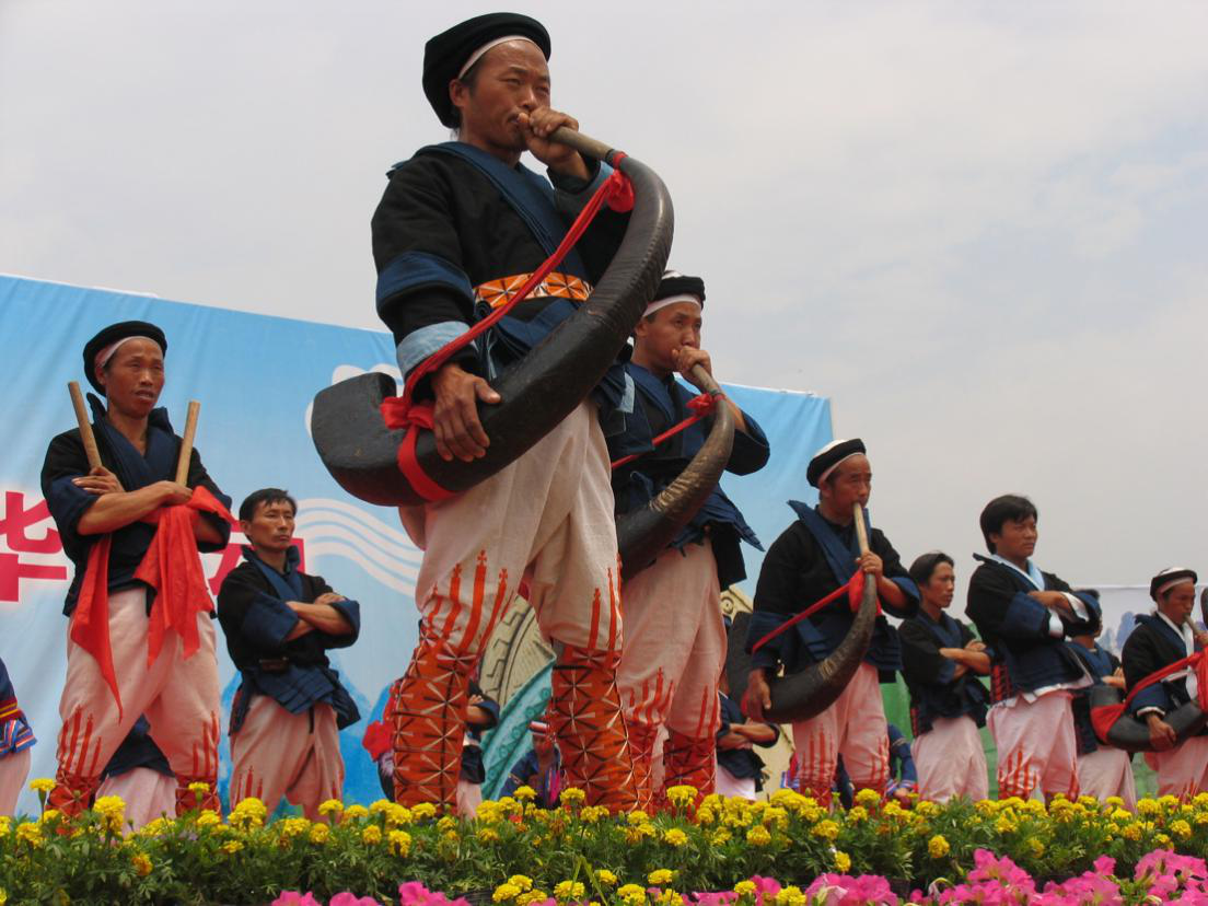 瑤族人民在節(jié)日慶典活動上用民族樂器演出(劉軍攝)