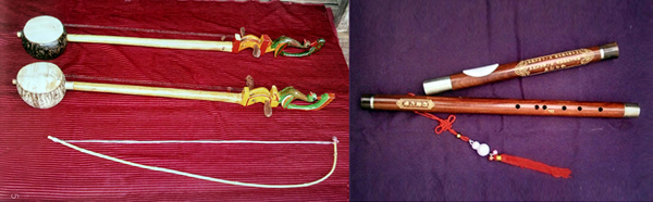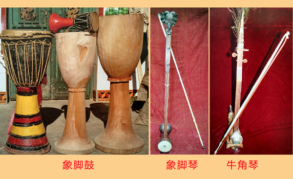 傣劇是在傣族民間歌曲和歌舞音樂的基礎上發(fā)展起來的,并借鑒了漢族戲曲藝術的表現(xiàn)手段,流傳于德宏、保山、臨滄等傣族聚居區(qū)。傣劇包括多種男女唱腔,男腔多用羽調(diào)式,女腔多用徵調(diào)式。20世紀50年代以來,傣劇吸收了多種傣族民歌和舞曲,豐富了唱腔,增強了音樂的表現(xiàn)力。傣劇唱腔基本是上下句組成的樂段及其變化反復。由于唱詞字數(shù)可多可少,因此唱腔樂句長短不一。過去,傣劇只用小堂鼓、鑼、镲等伴奏,后逐步采用了多種民族樂器及西洋管弦樂器,組成新型的傣劇樂隊。傣族的民族樂器屬于吹奏樂器的有篳、葫蘆簫(如圖)、豎笛、木葉等;彈撥樂器有玎琴、口弦等;弓弦樂器有西玎(玎琴)、牛角玎(牛角琴)等;打擊樂器有象腳鼓、光隆、光邊、光邦、鑼、镲等。象腳鼓、鑼、镲的合奏是傣族器樂合奏的主要形式。