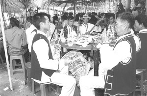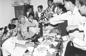 接著婚宴開始,八音隊(duì)吹奏的樂曲優(yōu)美動(dòng)聽,大家喝喜酒祝賀新郎、新娘;同時(shí),男方家的帶娘給女方家人開檳榔碗。開檳榔碗的順序是女方家人由老到小分別接檳榔碗,意在感謝女方長(zhǎng)輩、親屬對(duì)新娘的養(yǎng)育之恩。