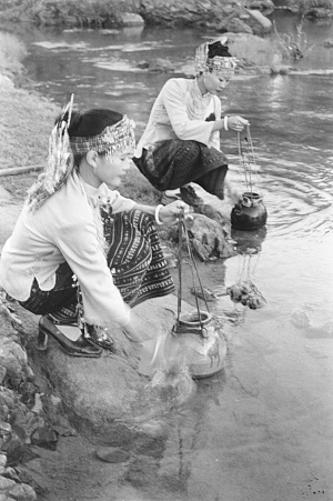 清晨,新娘、伴娘到河邊挑水