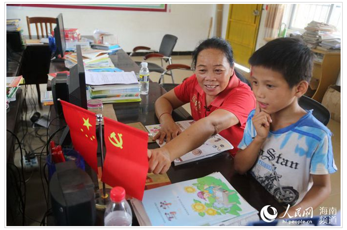 王金花教孩子認(rèn)識國旗和黨旗
