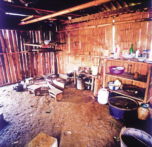 房內(nèi)一般隔成里外兩間,里間狹小,光線暗,是主人的臥室,只放雙人床和一小部分生活用品。外間寬大,是生火煮飯、聚會(huì)待客和子女就寢的地方?;鹛猎O(shè)在里間屋的門外,放鐵制三腳架,三腳架對(duì)應(yīng)的方位有固定的用途,即靠里間房門一方為主人的座位,靠外間房門一方為客人的座位,火塘上方靠墻處為子女的床位。如有成年子女和新婚夫婦,則在外間再隔出小間,里間和外間存放著生產(chǎn)用具和酒具。房內(nèi)幾乎沒有什么家具和裝飾性的陳設(shè),有的甚至沒有桌椅和床鋪,只在火塘周圍鋪著竹席或木板,合衣向火而眠?;鹛辽厦?米多高處懸掛著竹編的約1米見方的架子,上面放著食具、鹽巴、辣椒等,也是烘烤牛肉干的地方。架子上面靠房頂處并排放著幾個(gè)粗大的竹筒,里面存放糧食。這幾年的新村民居,在保持傳統(tǒng)民居特征的前提下使用了新型建材,更堅(jiān)固,更舒適。
